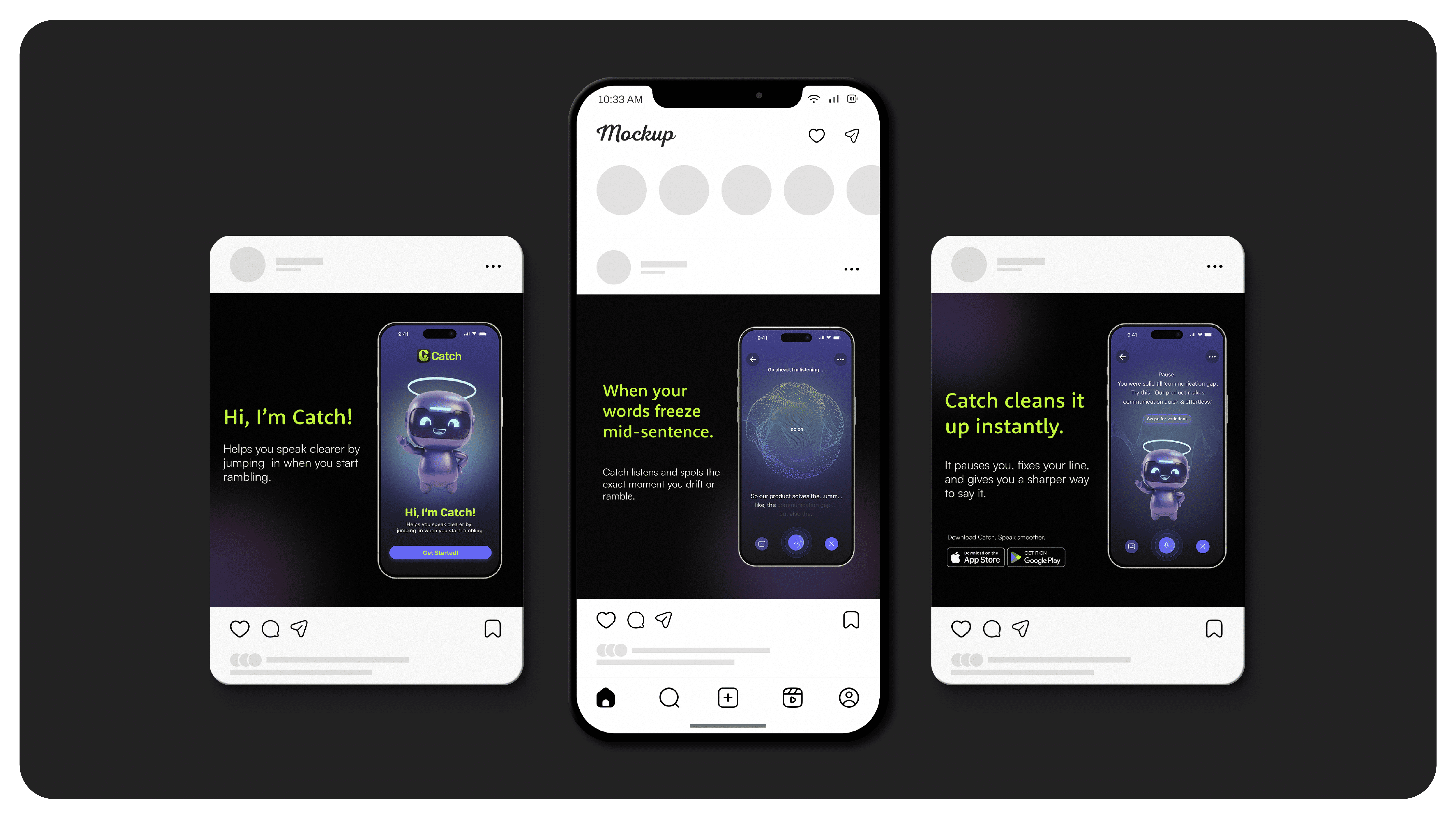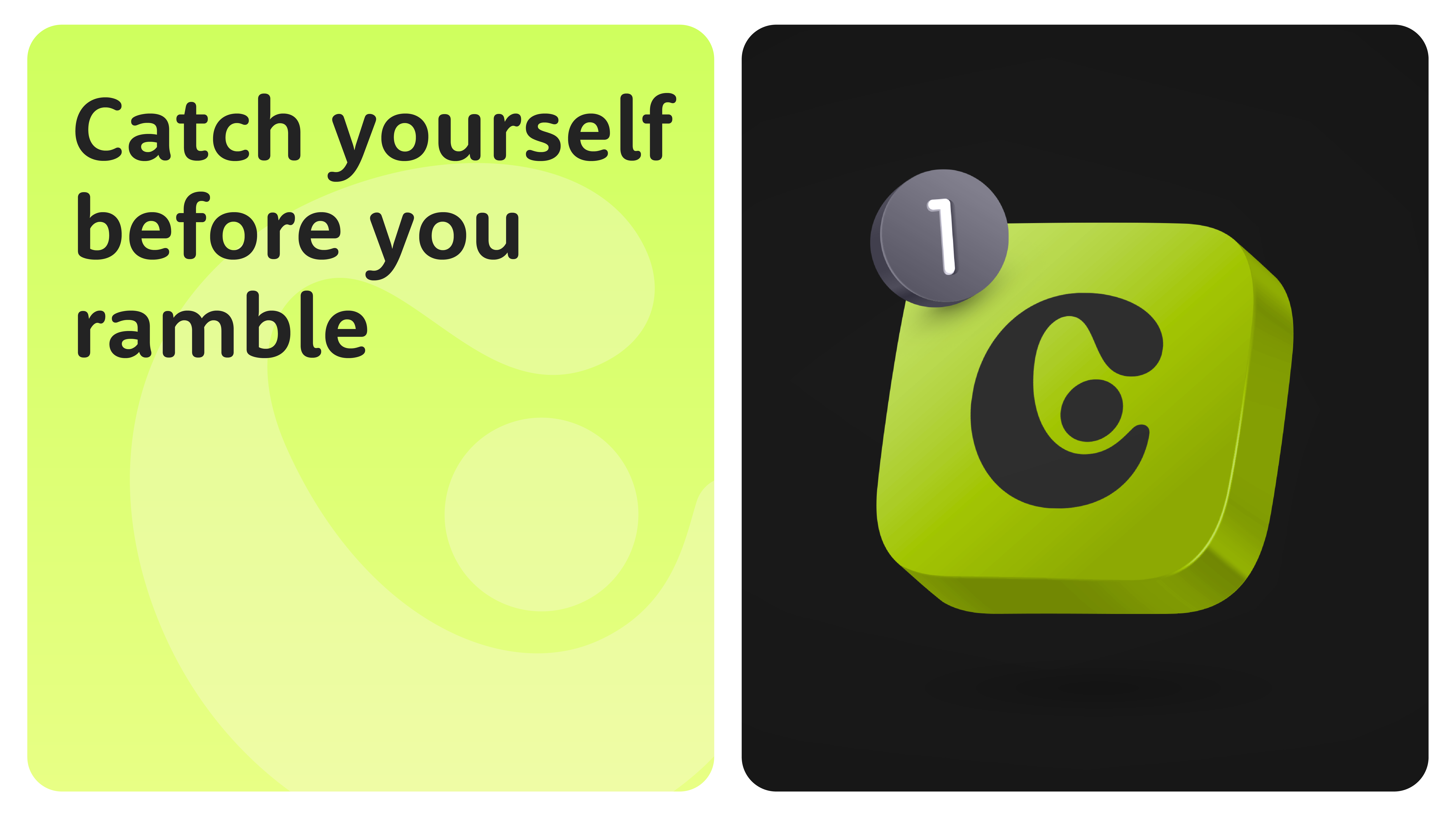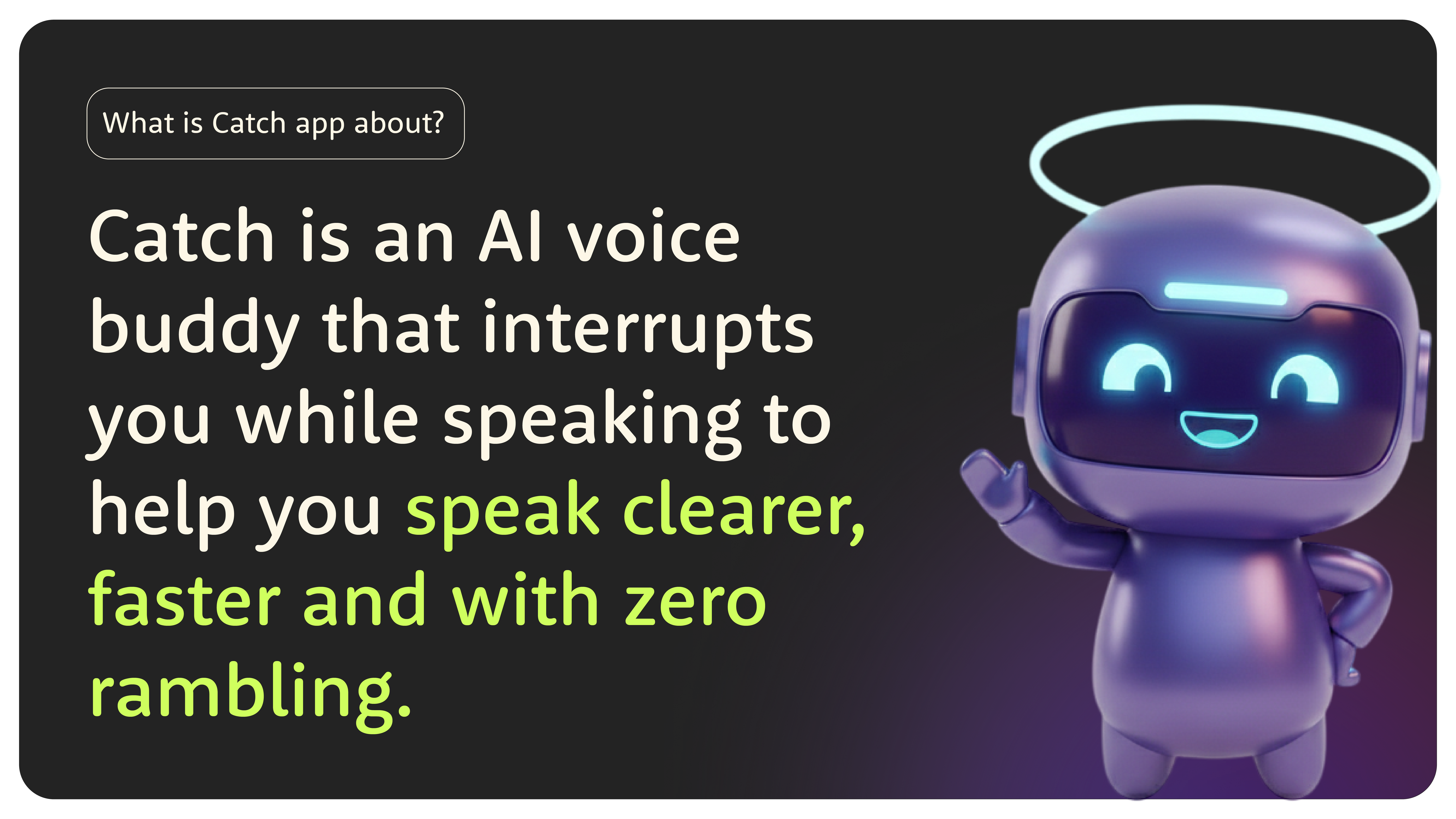 Catch listens while you speak and steps in at the exact moment you start spiralling. If you pause too long, repeat yourself, or drift off-topic, Catch interrupts with a short, friendly nudge and suggests a clearer version instantly. So instead of re-recording “Hi… okay wait… let me start again,” you get actionable guidance like “Finish that point in one line” or “Your best line was 10 seconds ago - tap to rewind.” It’s like having a sharp friend in the room who keeps you on track and helps you land your message confidently in one take.
