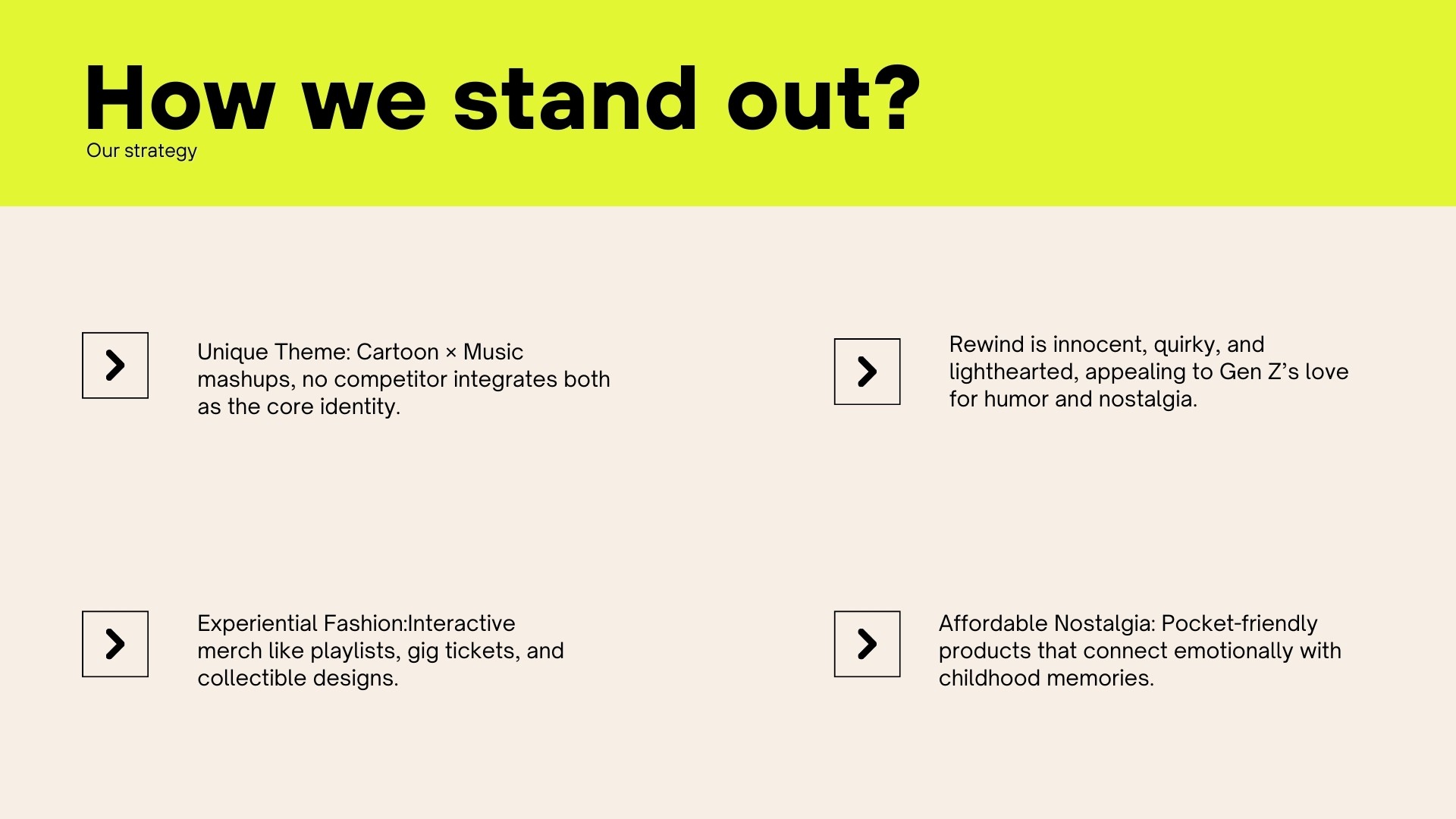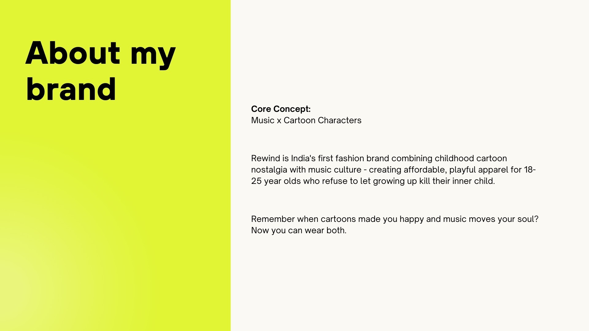 Rewind is a fashion brand that blends childhood cartoons with today’s music culture to bring joy back into everyday clothing. Our brand promise is to create playful, affordable pieces that spark memories and make people feel good. We value creativity, authenticity, and self-expression, and our goal is to make fashion fun instead of serious or stressful. We exist because young people shouldn’t have to let go of the cartoons they loved or the music that shapes them now. Our tagline, Joy on a Loop, reflects the idea that happiness-just like your favourite song or childhood show-should be something you can return to again and again. Rewind creates clothing that keeps that feeling alive.